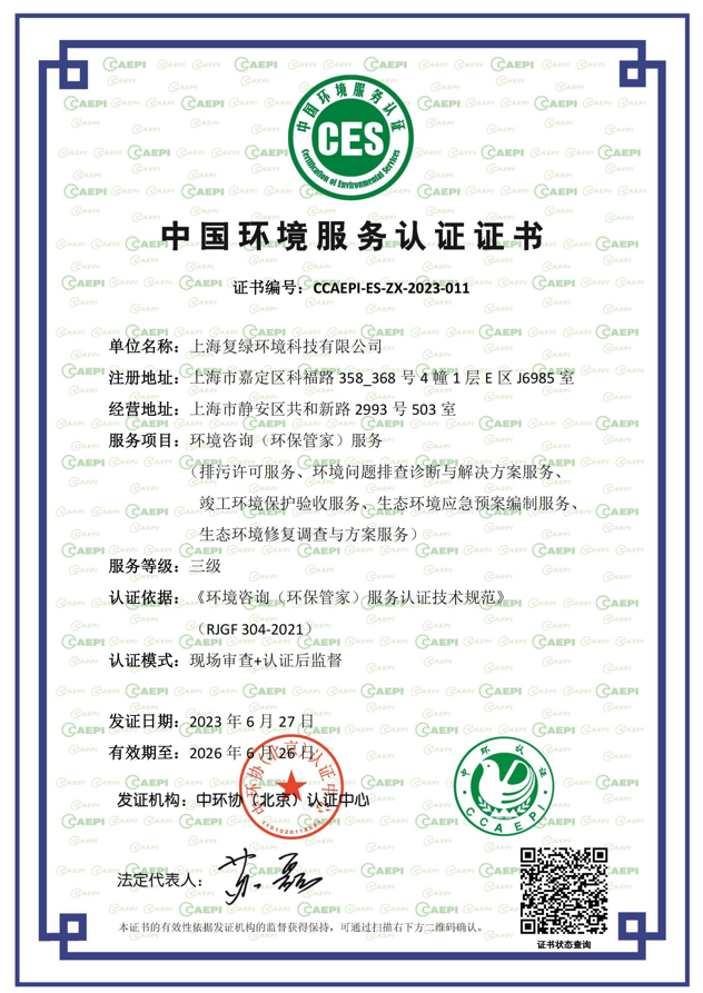 中国环境服务认证-环境咨询(环保管家)服务认证证书
